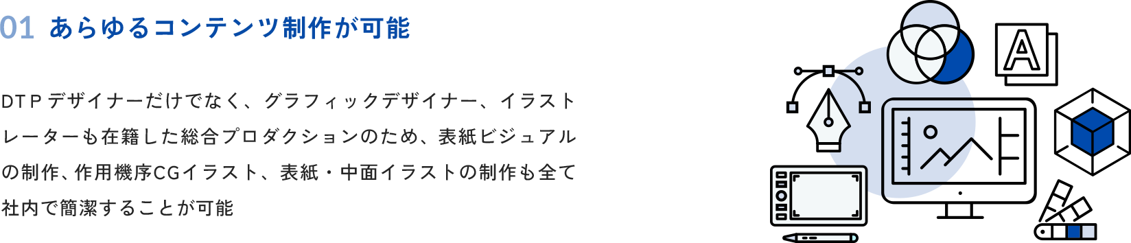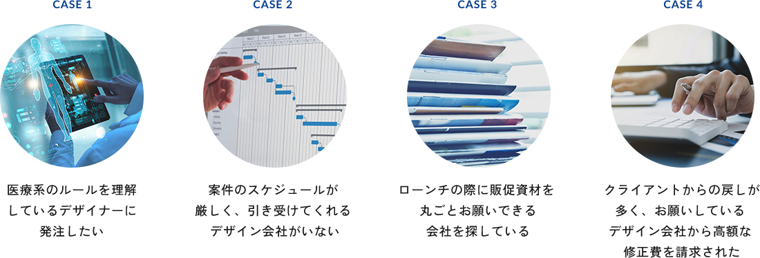 クライアント様との秘密保持契約上、実際に手掛けた成果物を一般のプロダクション様のように、事例としてサイトに掲載することが難しくなっております。お時間を頂けましたら担当営業が事例をお見せしに伺いますので、是非お問い合わせくださいませ。一例となりますが、医療用医薬品の制作物としては主に下記を手掛けております。