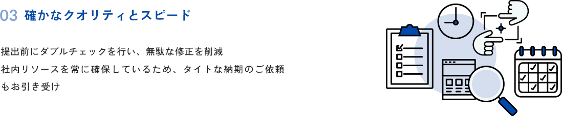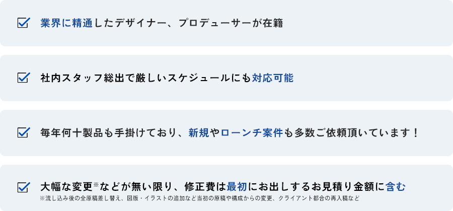 弊社では基本的にどのようなご依頼もお引き受けするよう心がけております。時にはデザイナーに無理を言うこともありますが、ご希望通りのスケジュールで納品できるよう社を挙げてご協力できればと思っておりますので、まずはご相談くださいませ。