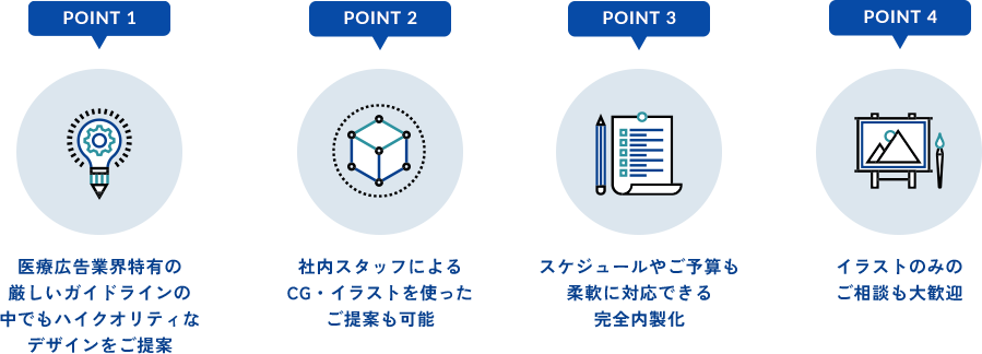 マス広告のデザイナーも在籍しており、現在も医療系広告に加えマス広告のご依頼もお請けしております。案件内容によってディレクターがデザイナーをアサインしているため、幅広いデザインをご提案可能です。お気軽にご相談くださいませ。